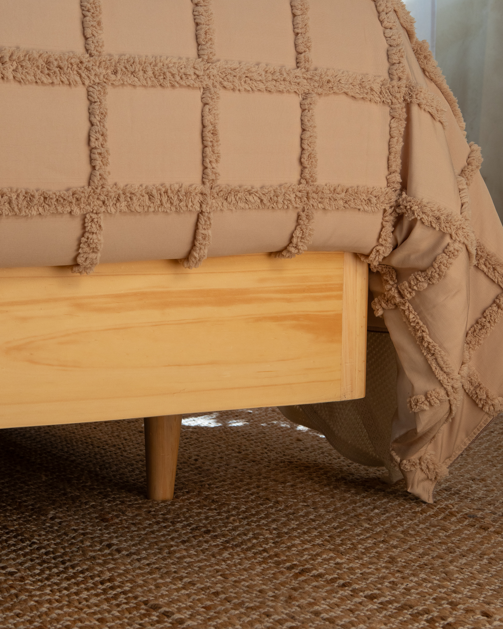 Base cama fabricada en madera maciza de pino reforestado, reconocida por su durabilidad, resistencia y origen sostenible. Cuenta con acabados sellados con tintes y lacas catalizadas, que realzan la textura natural de la madera y prolongan su vida útil.