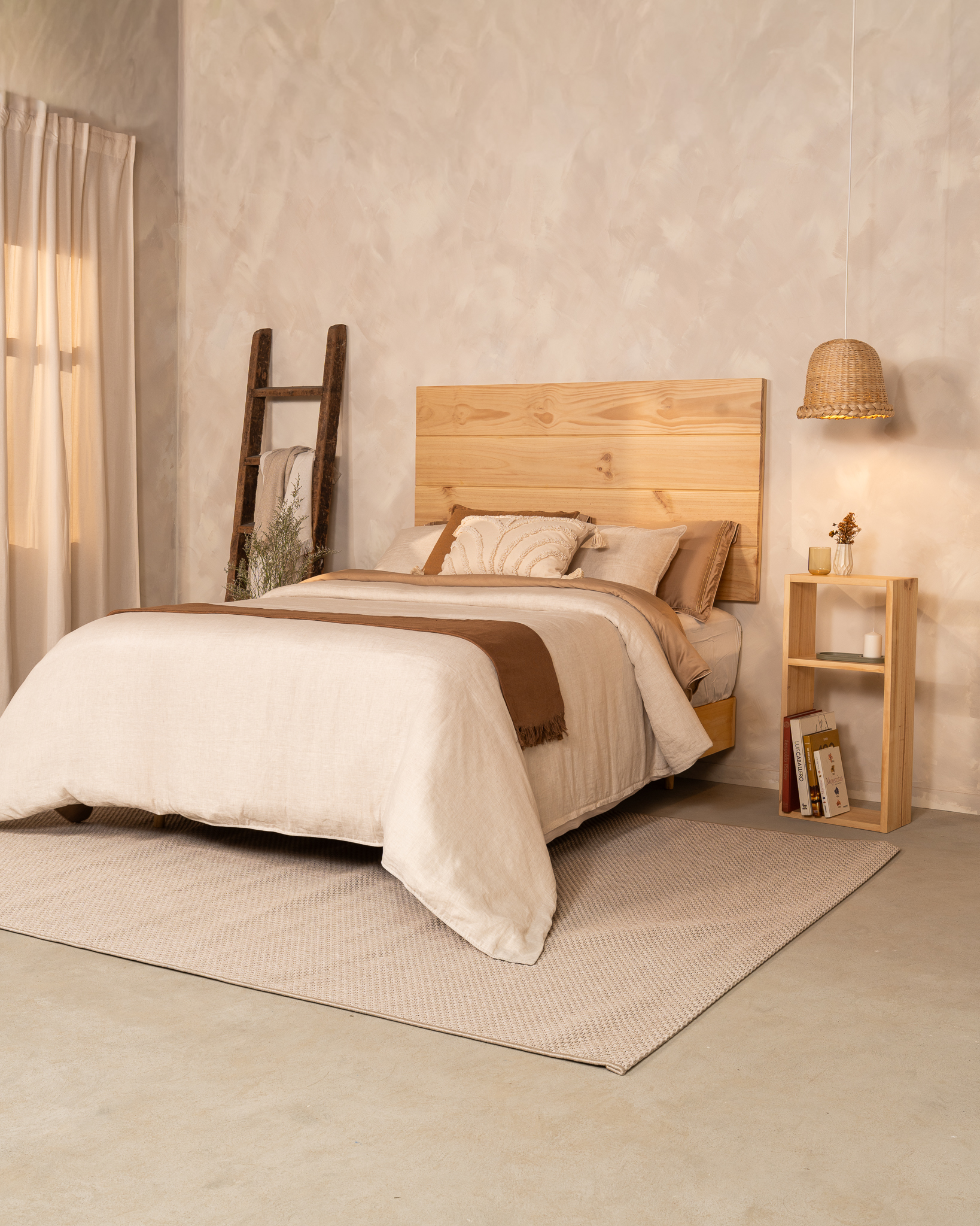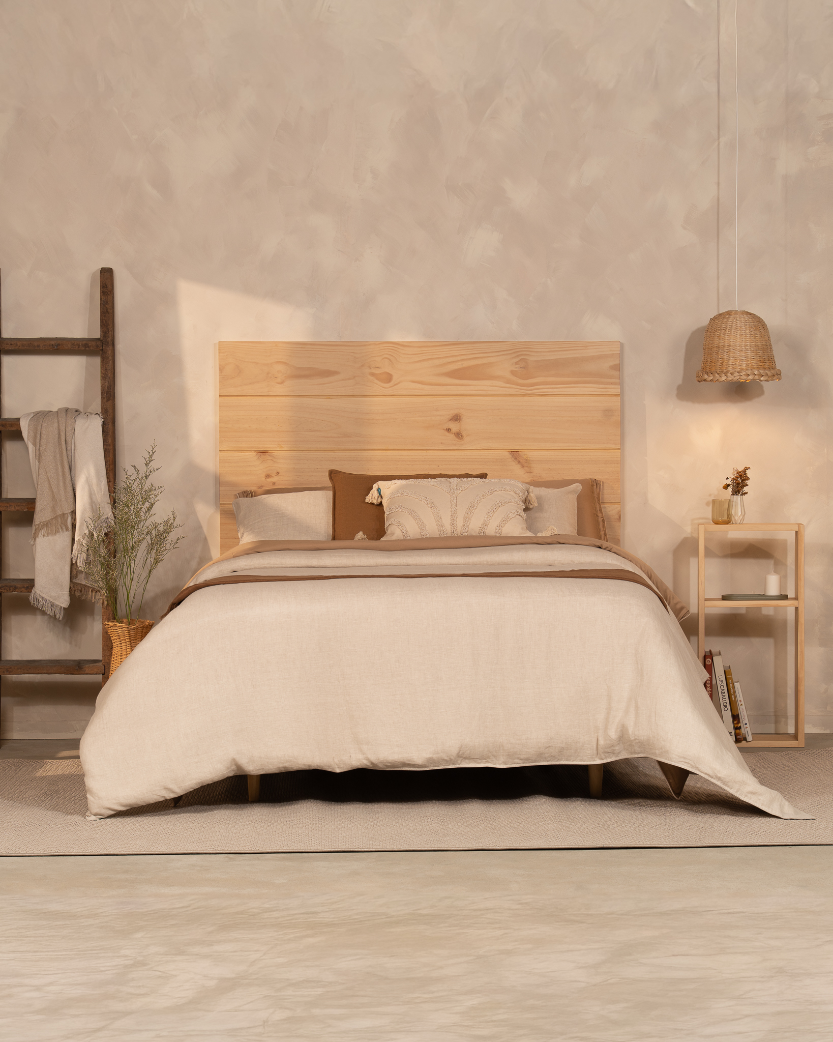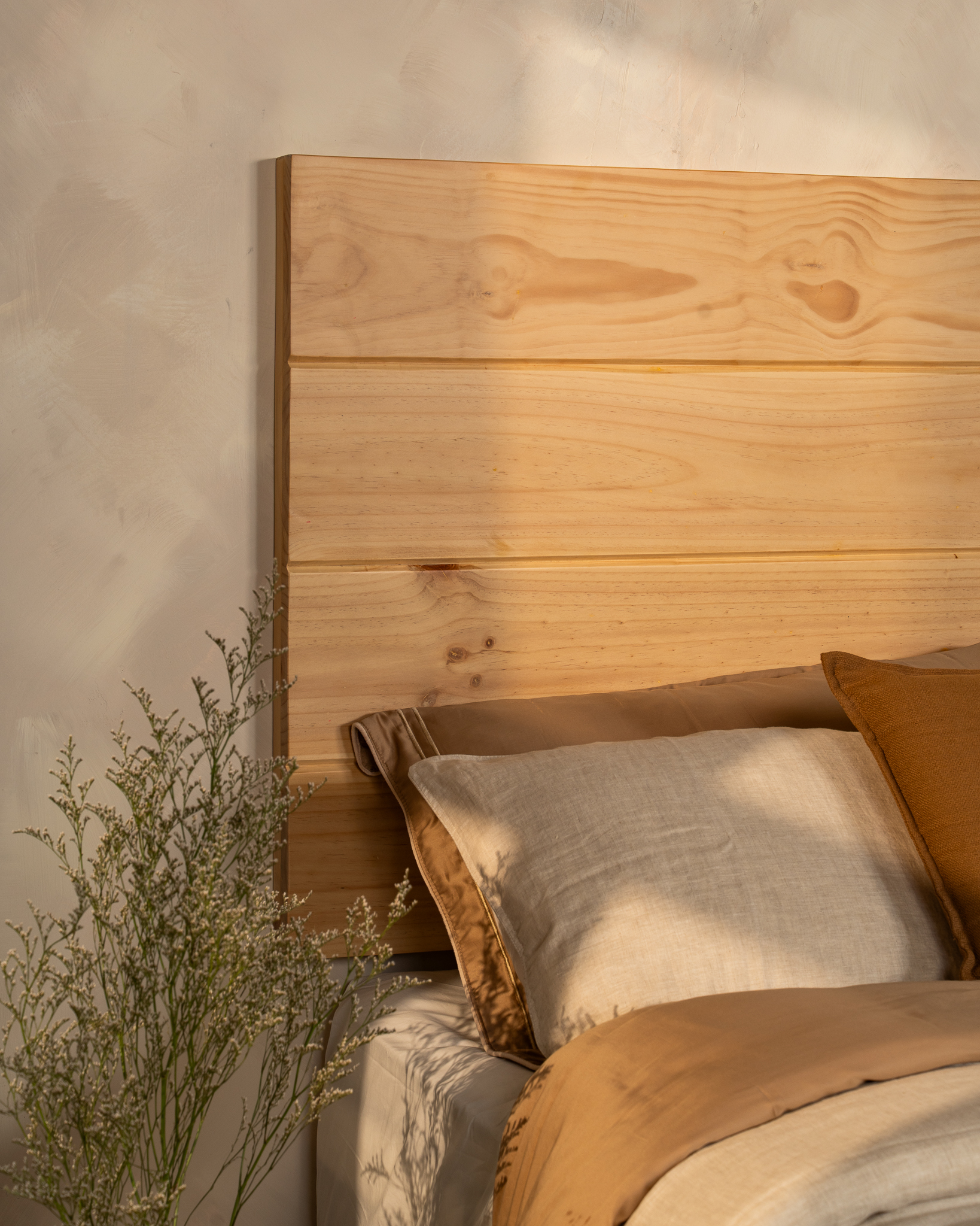 Cabecero dilatado de diseño minimalista y proporciones equilibradas. fabricado en madera maciza de pino reforestado, reconocida por su durabilidad, resistencia y origen sostenible. Cuenta con acabados sellados con tintes y lacas catalizadas, que realzan la textura natural de la madera y prolongan su vida útil.