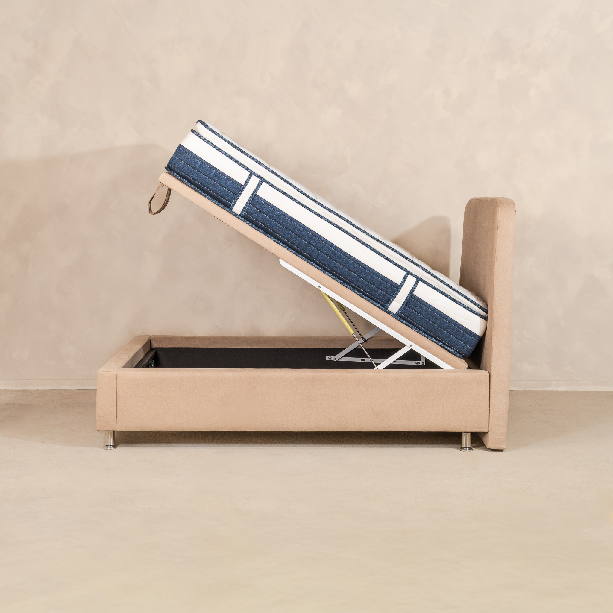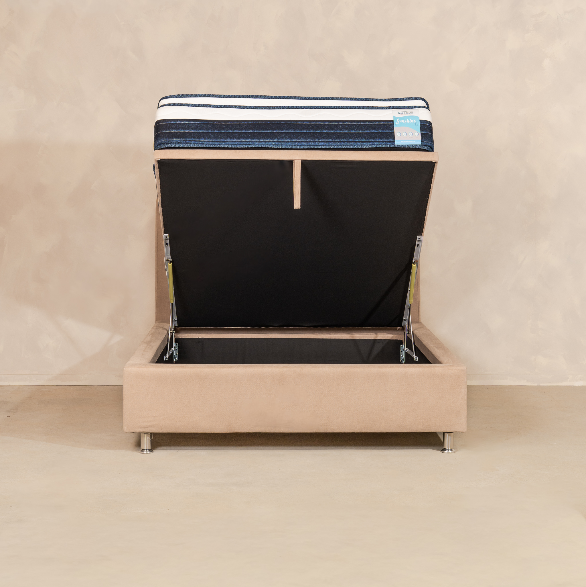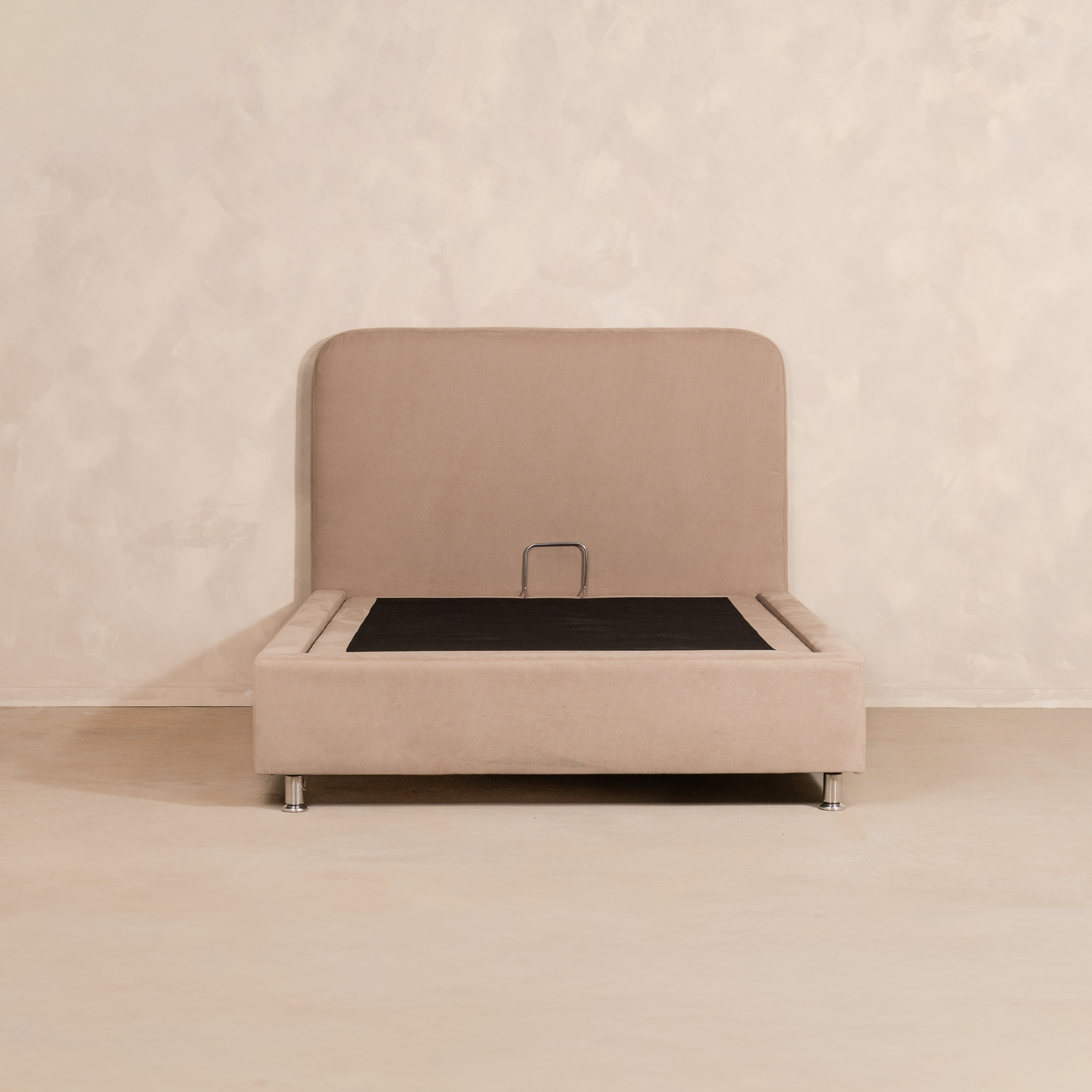 El baúl incorpora un sistema de apertura abatible con herrajes de 600 Nw, diseñado para ofrecer un uso suave, seguro y estable. Su compartimento oculto permite aprovechar al máximo el espacio disponible, brindando una solución funcional y estética para el almacenamiento dentro de la cama.