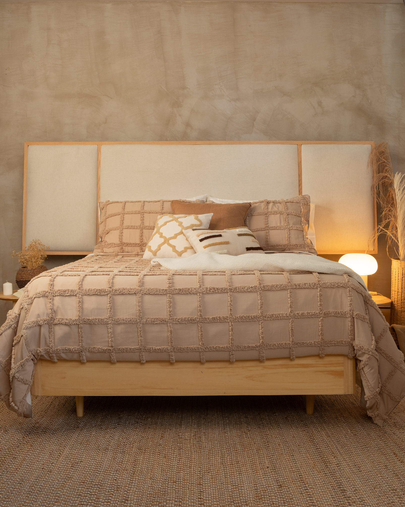 Base cama y cabecero fabricados en madera maciza de pino reforestado, reconocida por su durabilidad, resistencia y origen sostenible. Cuenta con acabados sellados con tintes y lacas catalizadas, que realzan la textura natural de la madera y prolongan su vida útil.