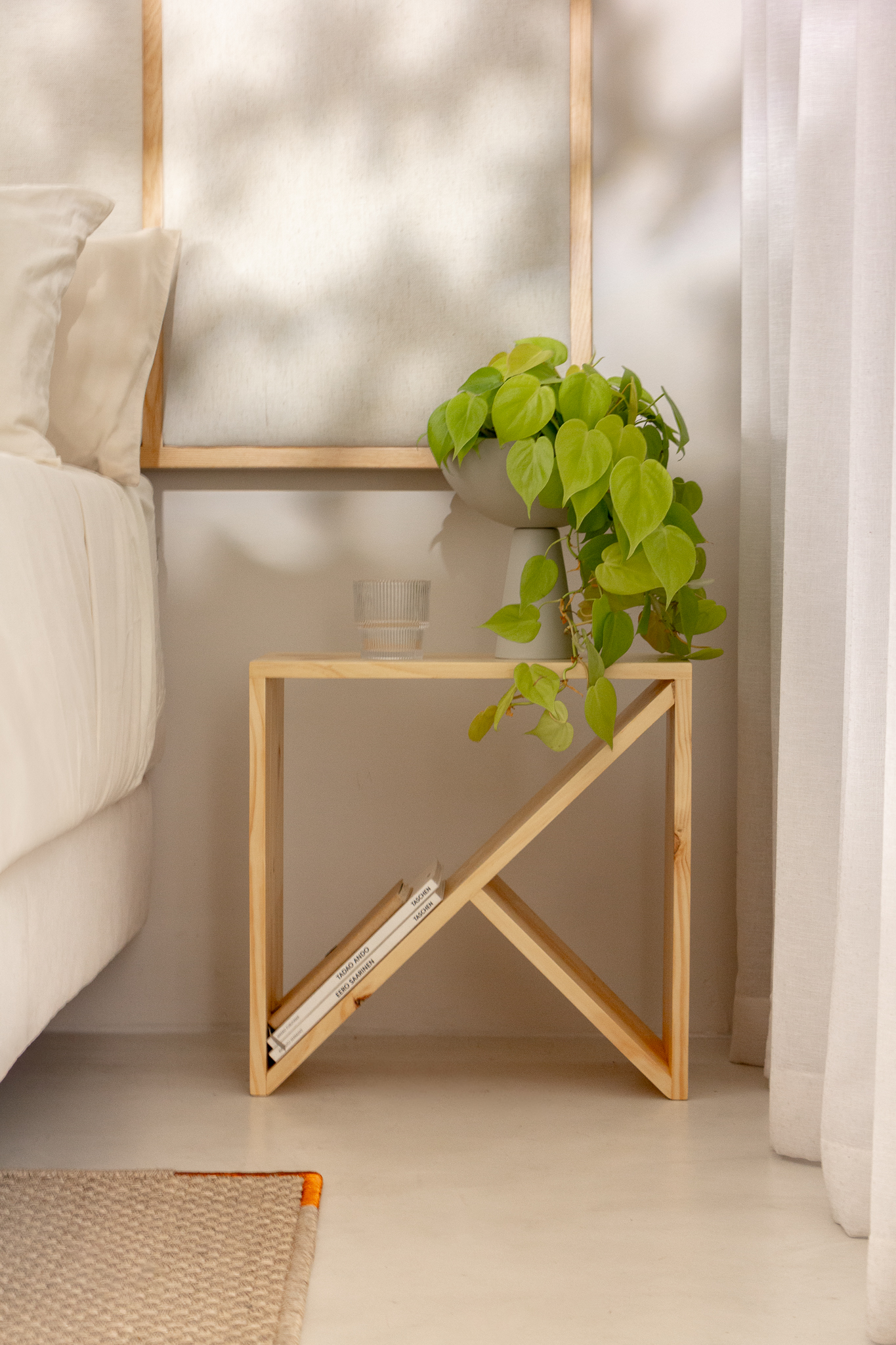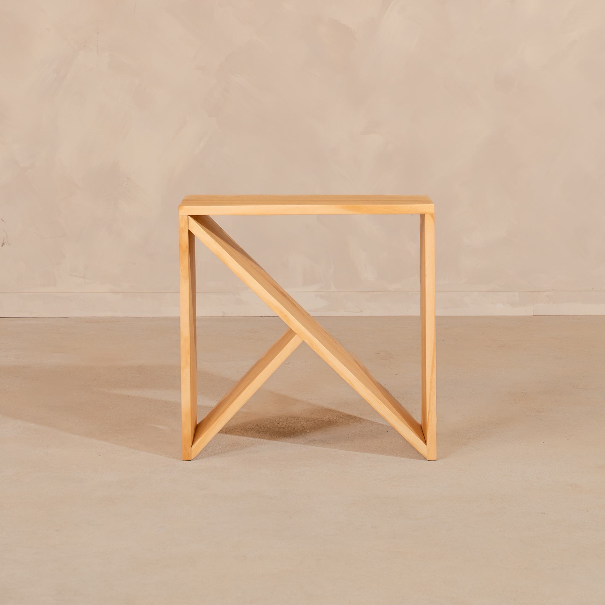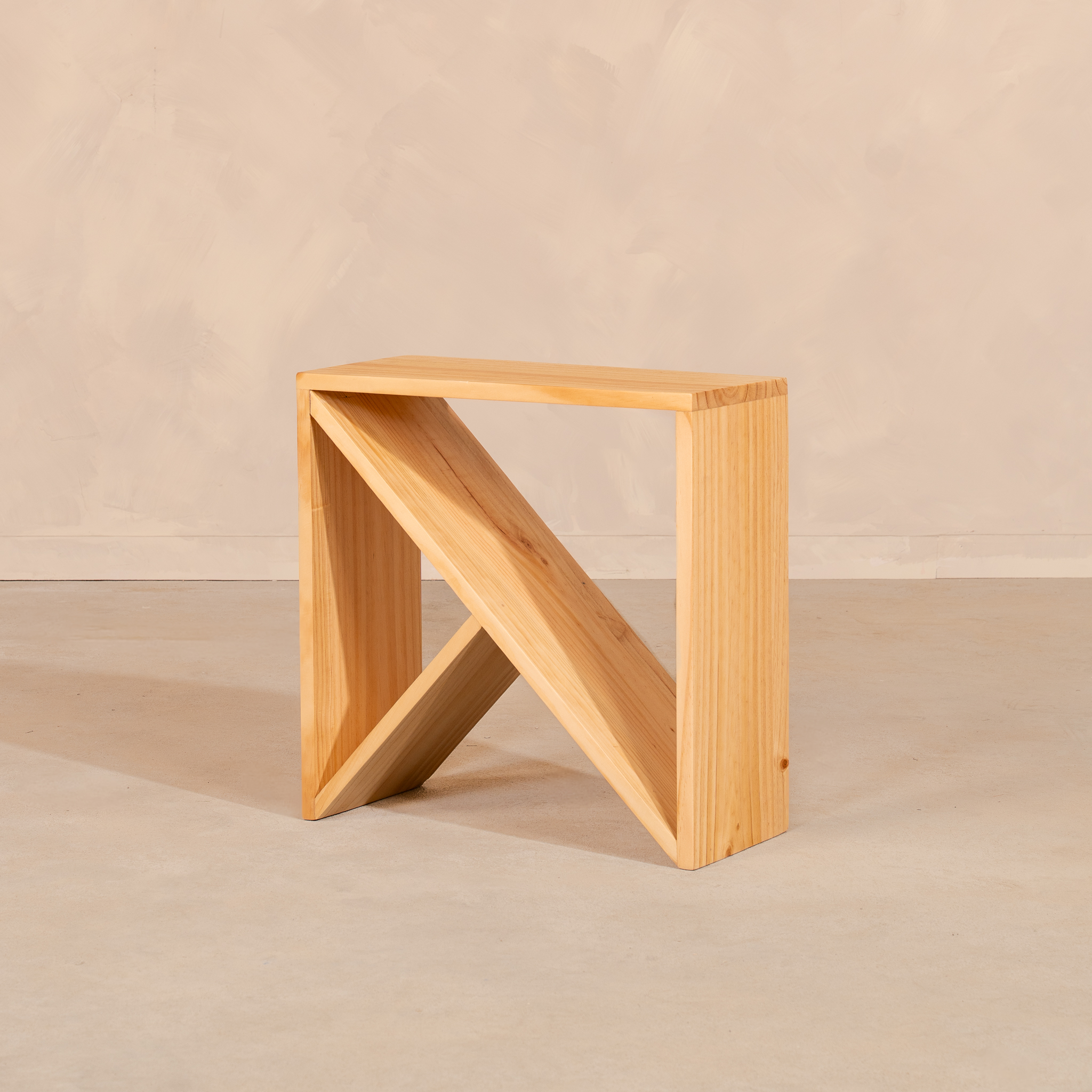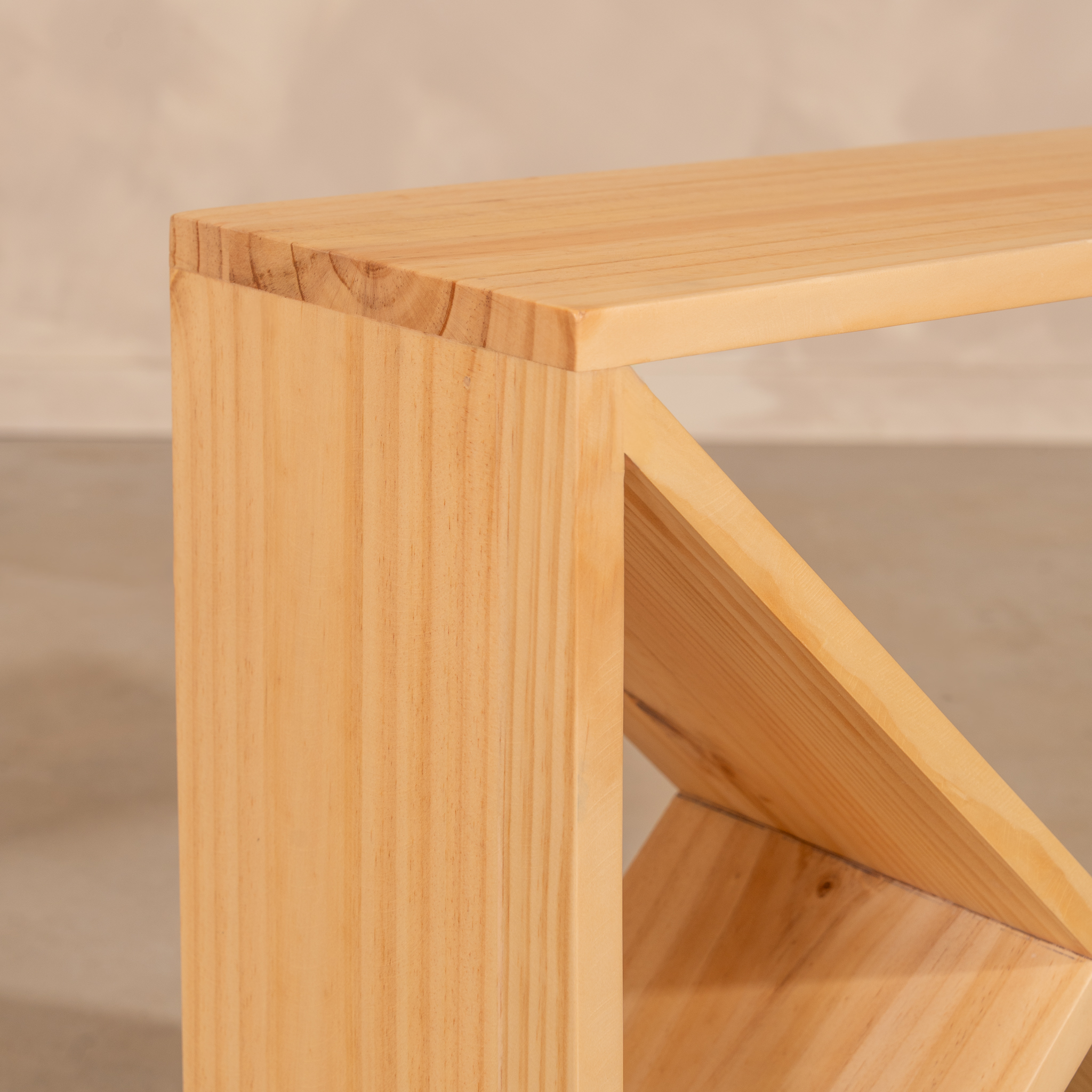 Mesa elaborada en madera maciza de pino reforestado, reconocida por su resistencia, durabilidad y origen sostenible. Su diseño estructural, de líneas diagonales y formas abiertas, resalta la belleza de la simplicidad constructiva y la pureza de la madera natural.
